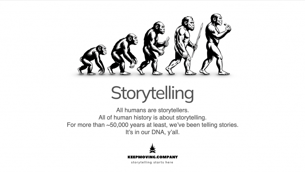 All humans, including you, are storytellers by definition. Even if you believe you aren’t good at [public speaking, talking to strangers, presenting, pitching, etc.], you are genetically designed to be a storyteller; it’s in our DNA. Epigenetically speaking, we are evolved to share stories.